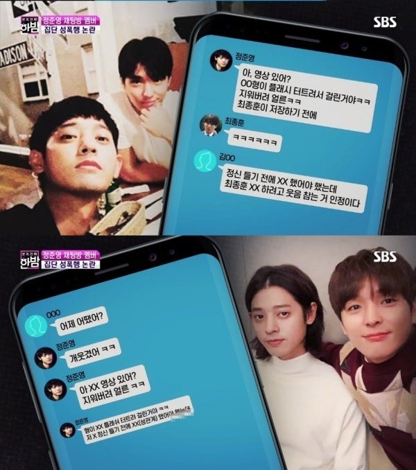22일 방송된 SBS ‘본격연예 한밤’에서는 대구 사인회 하루 전날 단체 대화방 멤버들에게 성폭행을 당했다고 주장하는 피해자 A 씨의 진술이 공개됐다. 이런 가운데 이 대화방 멤버들은 해당 피해 여성의 영상과 사진을 공유하고 이를 조롱까지 한 것으로 확인됐다.