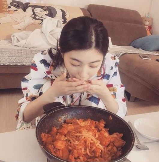 공개된 사진 속에서 이선빈은 귀여운 잠옷을 입은 채 닭갈비가 담긴 냄비를 보며 깜짝 놀란 표정을 짓고 있다.