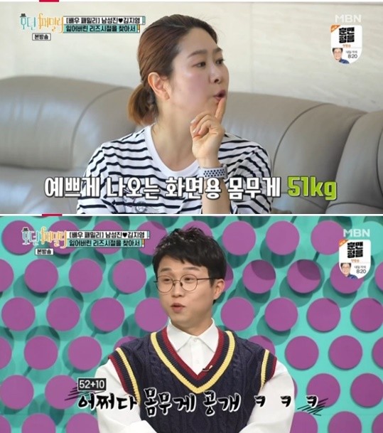 이후 두 사람은 서로의 살과 내장 지방 상태를 점검하다가 과거 가장 날씬했던 시절에 대해 이야기를 나눴다. 김지영은 “데뷔했을 때는 43kg였다. 가장 화면에 예쁘게 나오는 체중은 51kg이니까 10kg 빼야 한다”고 말했다.