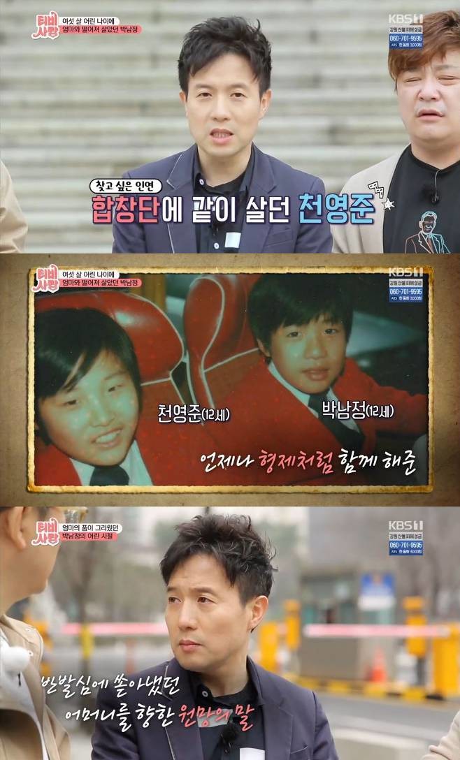 이어 박남정은 "내가 찾는 사람은 동갑내기 친구 천영준"이라며 "어렸을 때 '선명회 합창단'을 하면서 엄청 외롭게 지냈다. 활동 5년 만에 영준이가 들어와서 즐겁게 지냈다"고 말했다. 그는 "난 합숙을 하면서 엄마가 너무 보고 싶었다. 엄마께 죄송하지만, '왜 나를 혼자 놔두고 가셨냐'는 생각을 했다. 밤중에 엄마가 없을 때 엄마 찾아가려고 정류장을 찾아 헤멘 적도 있다. 보고 싶어서"라며 외로웠던 과거를 회상했다.