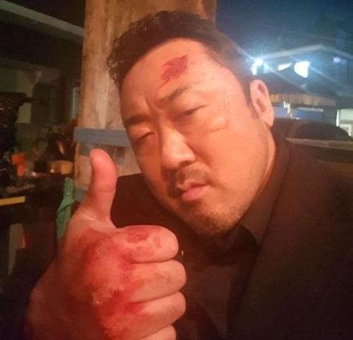 공개된 사진 속 마동석은 촬영 현장에서 피 분장을 한 채 엄지를 치켜들고 있어 눈길을 끈다.