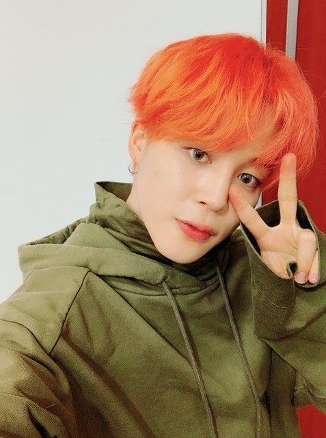 공개된 사진 속에는 지민이 후드가 달린 카키색 캐쥬얼한 옷을 입고 손으로 브이자를 그리고 있는 모습이 담겨있다. 지민의 뽀얀 얼굴이 화사한 헤어컬러를 한층 돋보이게 한다.