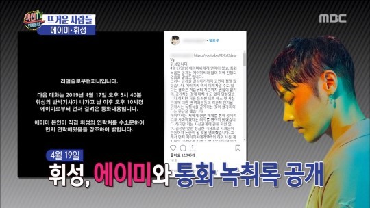 휘성은 ‘프로포폴 의혹에 대해 6년 전 무혐의를 받았으며 성폭행 논의는 전혀 사실이 아니다’라고 공식적으로 입장을 내며 ‘에이미가 공식적으로 사과하겠다는 의사를 밝혔으니 근거 없는 사실에 기반한 마녀사냥을 멈춰주시길 간곡히 부탁드립니다’라고 덧붙혀 눈길을 끌었다.