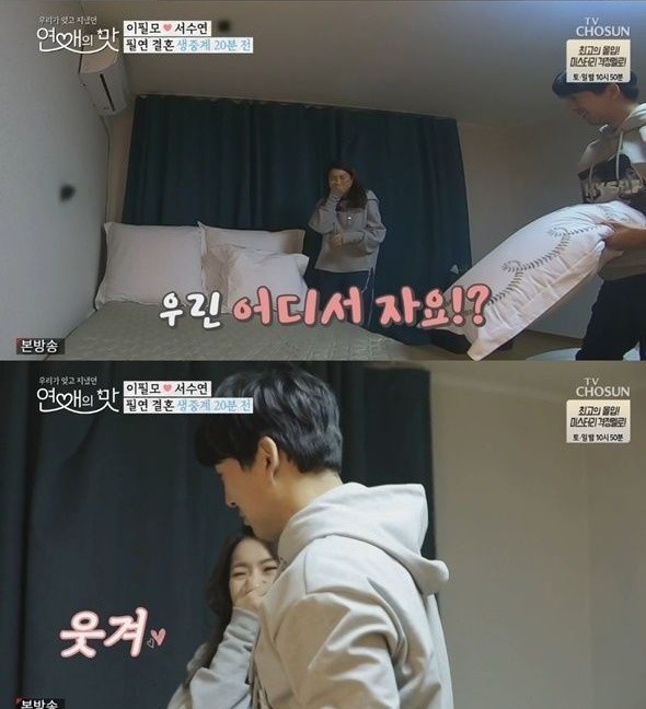 그러나 많은 베개로 인해 침대가 좁아지자 이필모는 “우린 어디서 자요?”라고 물었고 그 말을 들은 서수연은 웃음을 멈추지 못했다.