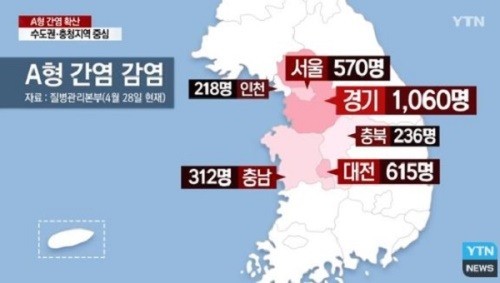 지난 4월 28일 질병관리본부에 따르면 올해 1월부터 이날까지 A형 간염 신고 건수는 3597명으로 지난해 동기간 1067명 대비 237% 증가했다.