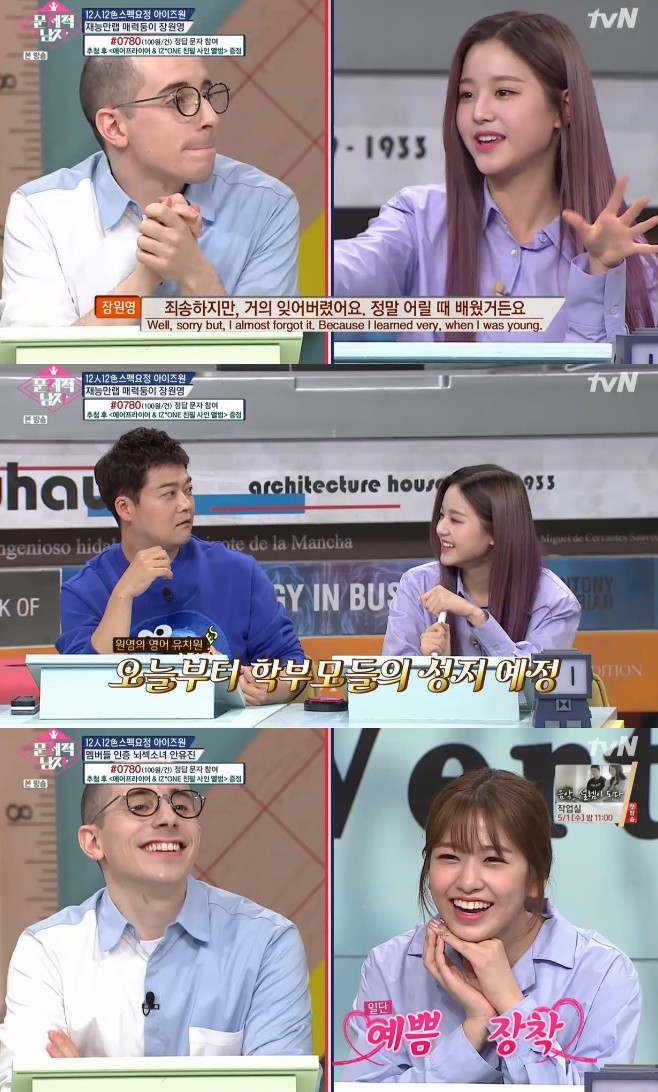 그러자 장원영은 유창한 영어 실력을 뽐내며 “죄송하지만 거의 잊어버렸다. 정말 어릴 때 영어를 배웠다”고 말해 주위를 놀라게 했다.