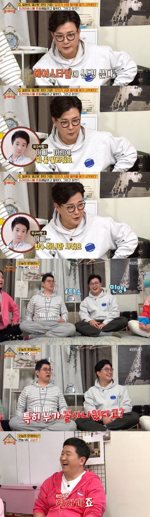 김성주는 중3의 아들 민국 군이 최근 중2병을 겪고 있다며 “요즘 헤어스타일에 신경을 쓰기 시작했다. 중요한 날엔 머리에 뭔가를 발라달라고 한다”라고 폭로했다.