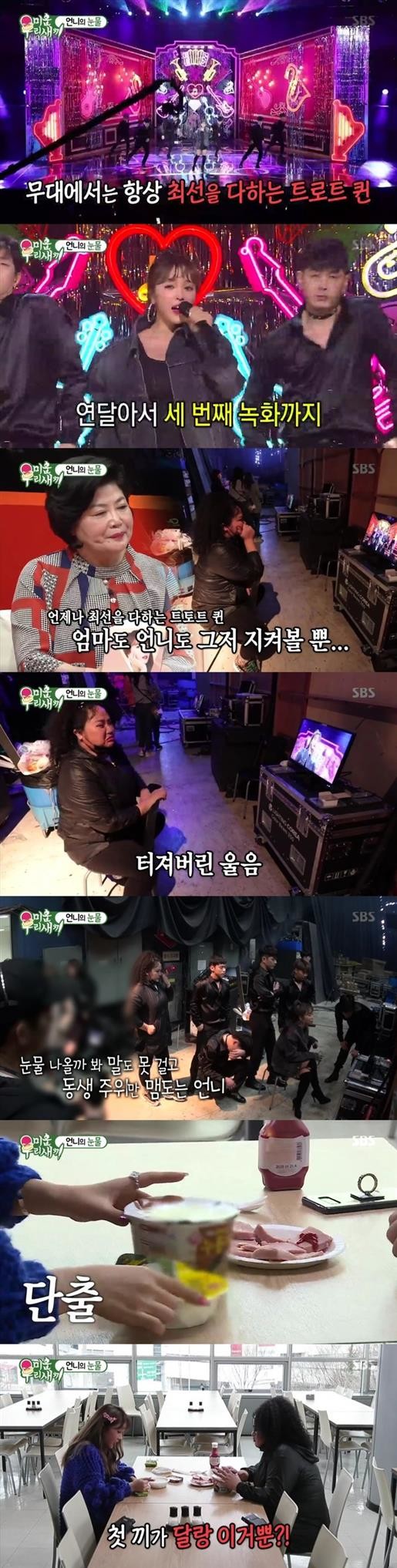 이후 방송국 매점을 찾은 홍진영과 홍선영은 컵라면과 즉석밥, 햄을 먹으며 하루를 마무리했다.