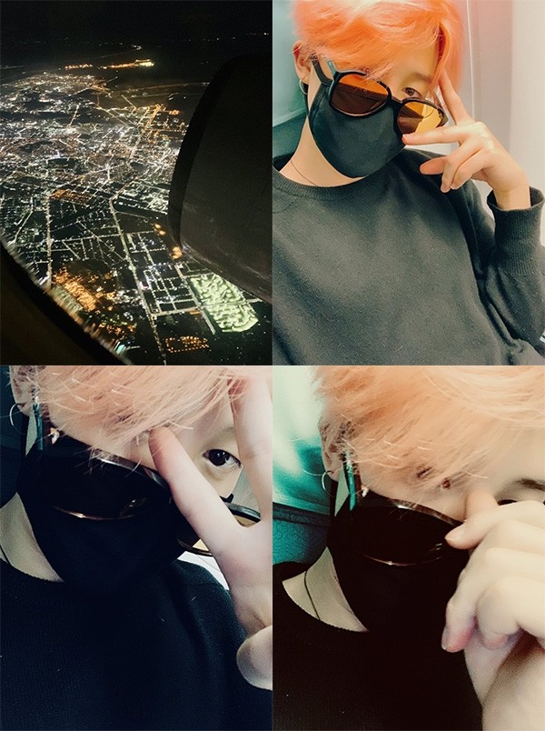 멤버 지민은 방탄소년단 공식 트위터에 "저희는 잘 도착했답니다"라는 글과 함께 비행기에서 찍은 미국 야경과 커다란 선글라스와 마스크를 쓴 채 브이와 하트를 하고 있는 자신의 셀카 사진을 올렸다.