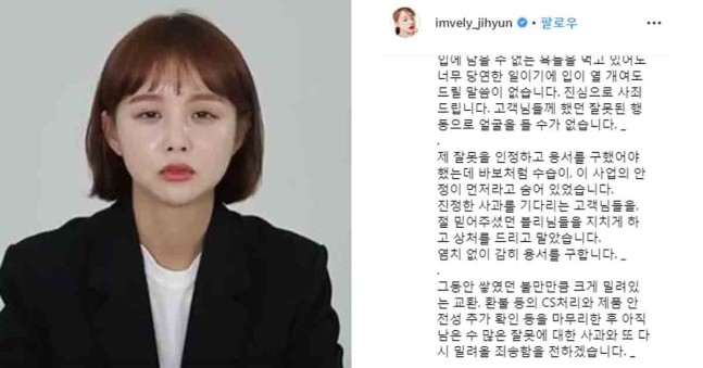 임지현 상무는 사과문에서 "저희 제품을 파는 유통사는 고객 항의로 몸살을 앓고, 회사 매출은 급격히 줄어 생존을 걱정해야 하고, 직원들은 끝이 보이지 않는 뒷수습에 지쳐가고 있다"고 밝혔다.