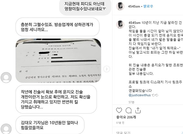 해당 글에서 A씨는 "작년에 진술서 확보 후에 윤지오 진술 개판이런거 눈으로 확인하고. 저도 확신을 가지고 취재하고 있지만 번번히 킬 당했다"며 "김대오 기자님은 10년동안 얼마나 힘들었을까"라고 말한다.