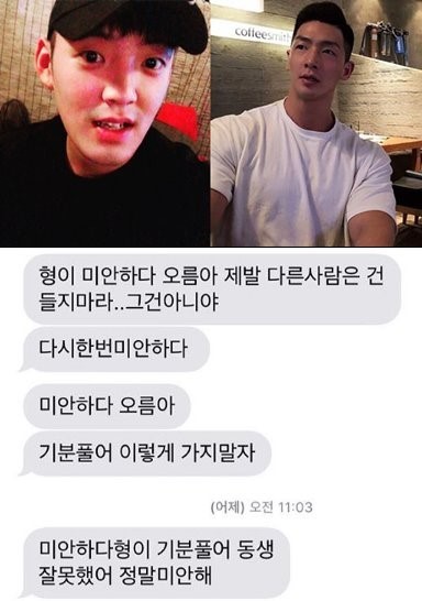 사진 속 문자에는 양호석이 “형이 미안하다. 오름아 제발 다른 사람은 건들지마라. 그건 아니야. 다시한번 미안하다. 기분 풀어 이렇게 가지말자. 동생 잘못했어 정말 미안해”라는 계속 차오름에게 사과하는 내용이 담겨있다.