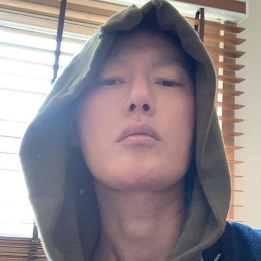 공개된 사진 속 허지웅은 눈썹을 모두 민 모습으로 카메라를 바라보고 있다. 허지웅은 항암 치료로 인해 눈썹이 거의 없어진 모습이다.
