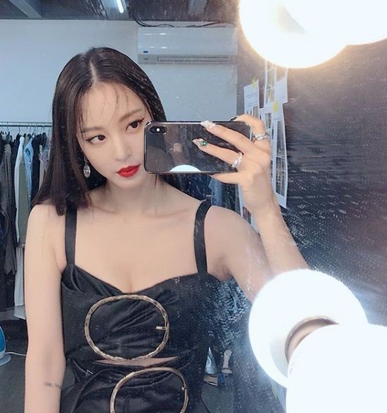 공개된 사진 속엔 가슴이 파인 원피스에 레드립을 매치한 한예슬이 거울을 이용해 셀카 사진을 찍고 있다.