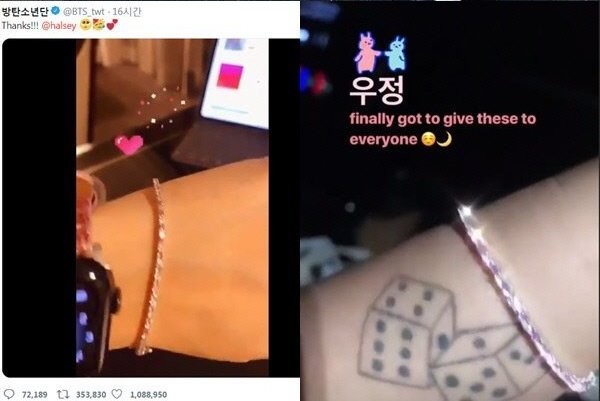 영상에는 각도에 따라 반짝이는 팔찌를 차고 있는 방탄소년단 멤버 모습이 담겨 눈길을 끈다. 할시 또한 이날 자신의 인스타그램 스토리를 통해 영상 하나를 올렸다. 앞서 방탄소년단이 트위터에 올린 영상 속 팔찌와 동일한 제품이다. 또 한국말로 “우정”이라는 멘트도 덧붙여 눈길을 끌었다.