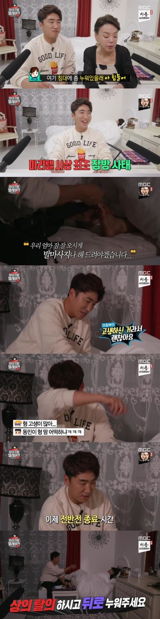 김수미는 “여기 침대에 좀 누워있을래. 힘들어”라고 누우며 “동민아. 불 좀 꺼라”라고 부탁했다. 장동민은 “선생님 잠 잘 오게 발마사지도 할게요”라고 마사지를 시작했다.