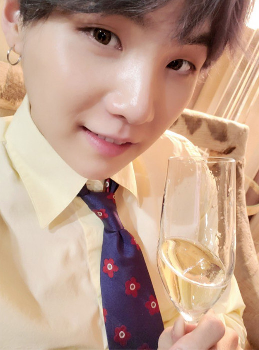 방탄소년단 멤버 슈가가 샴페인잔을 들고 달달한 미소로 팬심을 녹였다.