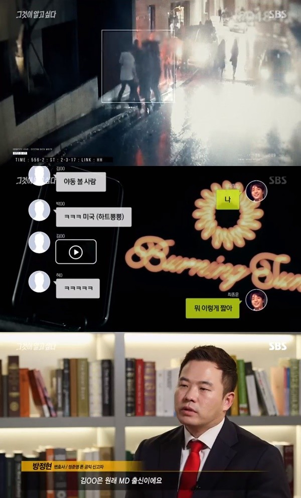 이날 제작진은 "2016년 4월 17일 밤 단톡방에서 대화가 시작됐다. 승리와 함께 미국에 간 김씨가 성관계 영상을 두차례 전송했다. 최종훈 정준영 유인석, YG 직원 등이 속해있는 단톡이었다"고 밝혔다.