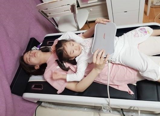 공개된 사진 속에는 정가은이 자택에서 누워 의료기를 체험하고 있는 모습이 담겨 있다. 정가은의 딸 소이는 누워있는 정가은의 주위에서 다양한 포즈를 취하며 보는 이들의 시선을 강탈하며 흐뭇한 미소를 자아내고 있다.