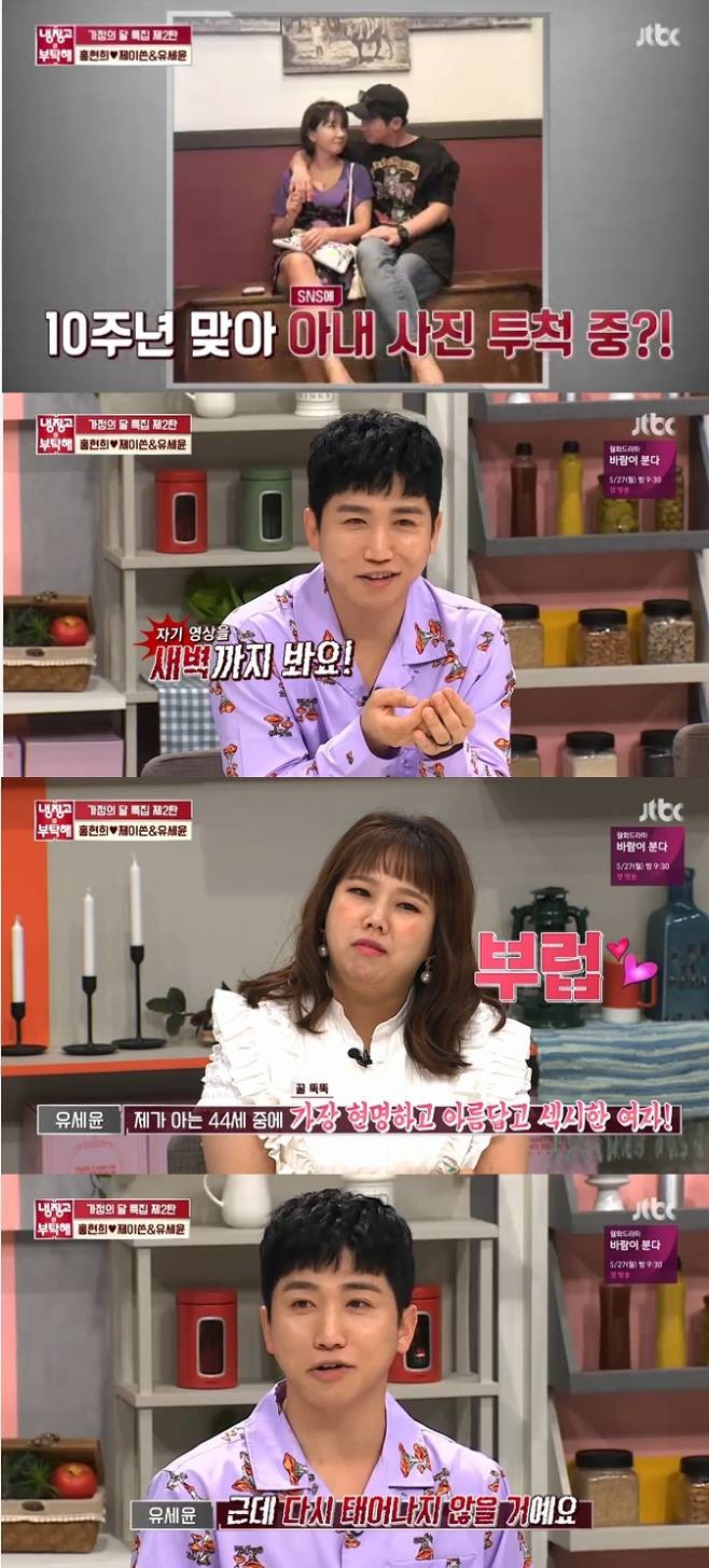 이날 MC들은 유세윤에게 "10주년을 맞아서 그런건지 최근 SNS에 아내와 함께한 사진이 유난히 많이 올라온다"고 물었다. 이에 유세윤은 “요즘 핫한 아이템이 가족이다"라며 너스레를 떨어 웃음을 자아냈다. 유세윤은 “SNS에 영상을 올리면 아내가 그걸 새벽까지 본다. 앞으로 영상 올리면 꼭 얘기해달라고 하더라”고 털어놨다.