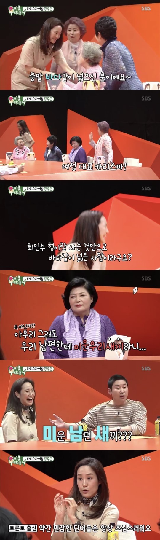 이어 강주은은 "2년 전쯤에 '미우새' 프로그램 이름을 몰랐다. 남편과 식당을 갔는데 직원분들이 남편이 '미우새'에 출연한 줄 알고 '미운우리새끼에서 봤다'고 하셨다"며 "저는 아무리 그래도 남편한테 어떻게 욕을 할 수 있지? 라고 생각했다"고 전했다.