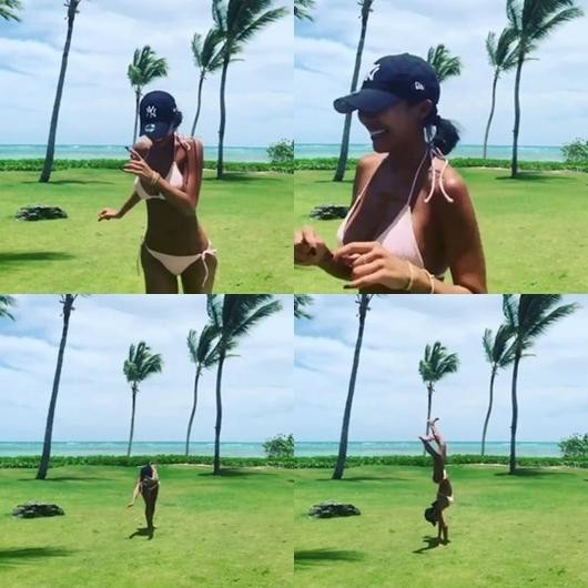 공개된 영상 속 제시는 휴양지에서 보기만해도 아찔한 비키니를 입고 앞돌기를 하고 있는 모습. 탄탄한 구릿빛 몸매가 시선을 사로잡는다.