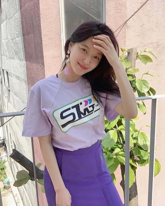 공개된 사진 속에는 퍼플톤의 티셔츠와 치마를 입은 조우리가 난간에 기대서 포즈를 취하고 있는 모습이 담겨있다.