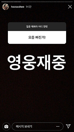 앞서 지난 5월 4일 한서희는 자신의 인스타그램(SNS) 스토리에 "요즘 빠진거!"라는 질문에 "영웅재중"이라며 JYJ 김재중을 언급한 것.