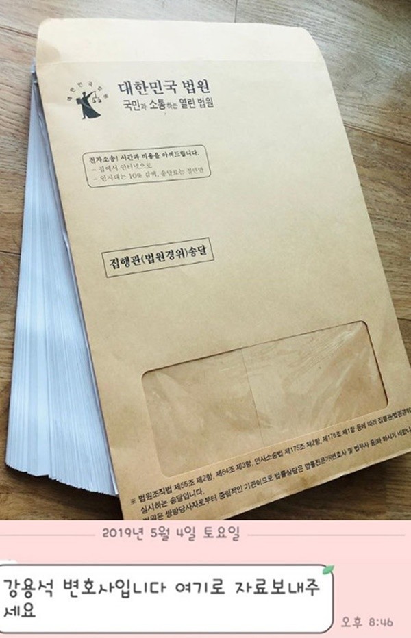 이후 5월 6일, A 씨는 한 장의 사진을 다시 게재했다. 사진은 변호사 강용석으로부터 온 카카오톡 메시지 캡처본으로 "강용석 변호사입니다. 여기로 자료 보내주세요"라는 내용.