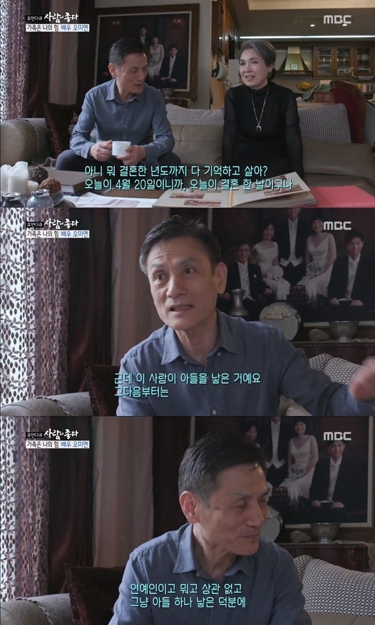 오미연 남편은 “처음엔 부모님이 집사람의 배우라는 직업 때문에 반대했다. 그때는 배우를 딴따라라고 했다”고 밝혔다. 오미연은 “그때 시부모님 생각이 잘못됐었다”고 덧붙였다.
