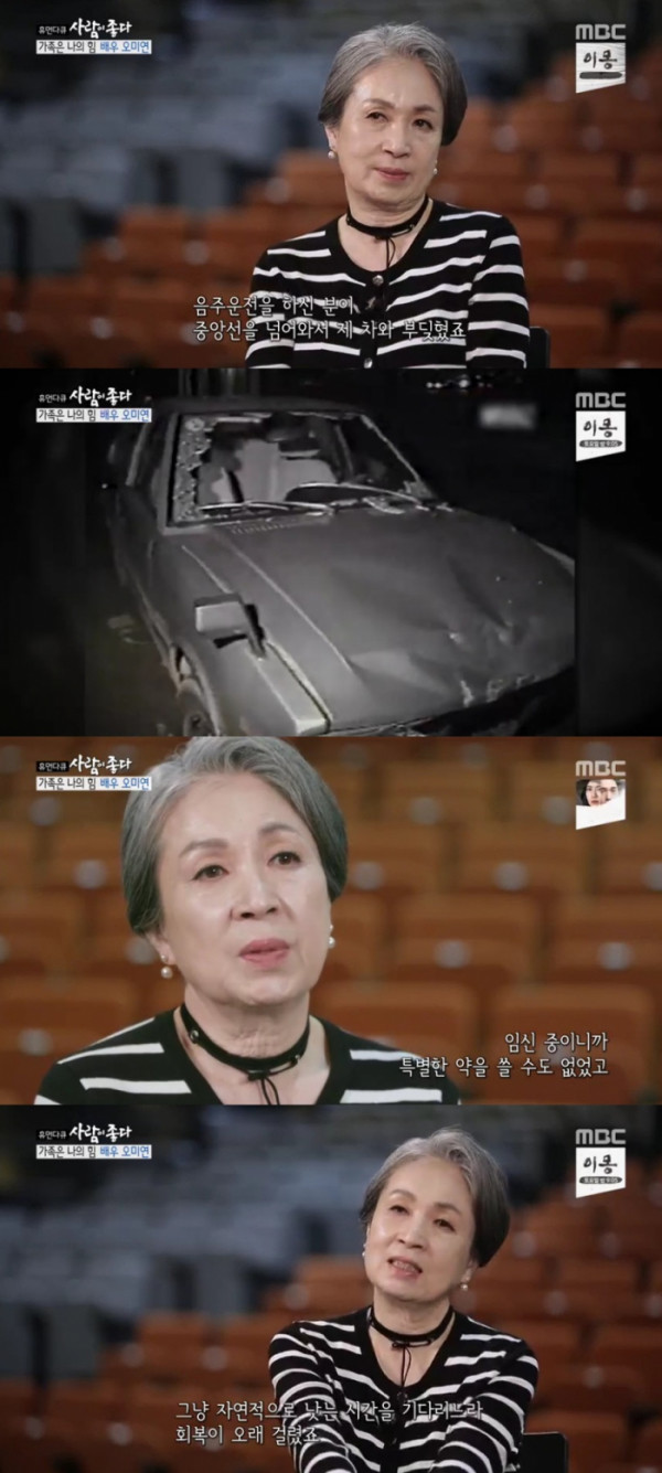 이날 오미연은 “광고 찍고 돌아오는 길이었다. 음주운전 차량에 사고가 났다. 이마가 다 찢어지고 코도 절단됐다”라며 “하필 안전벨트를 안 했었다. 양쪽 무릎이 다 깨졌다. 성한 것은 오른손 하나였다”라고 회상했다.