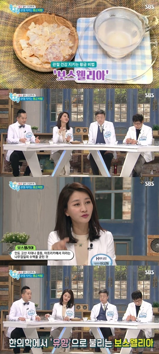 이날 방송에서 안지현 가정의학과 전문의는 "보스웰리아는 인도, 중동, 아프리카에서 자라는 나무 안에 껍질 속의 수액을 굳힌 것이다. 나무 한 그루에서 2년에 한 번 500g 미만의 극소량만 생산돼 '사막의 진주'라고 소개된다"라고 전했다.