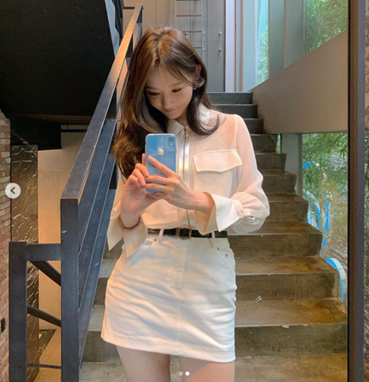 사진 속 강민경은 거울 속에 비친 자신의 모습을 핸드폰으로 담고 있는 모습. 강민경은 시스루 소재의 블라우스에 흰색 초미니 스커트를 매치해 깔끔하면서도 여성스러운 룩을 완성했다.