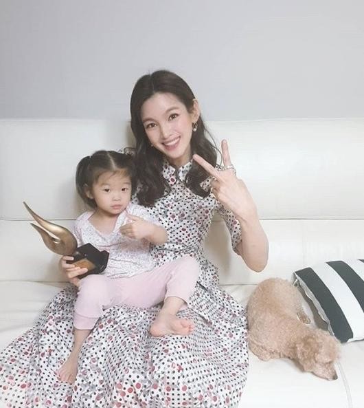 공개된 사진 속 정가은은 직접 받은 트로피를 들고 딸과 함께 인증샷을 남기고 있다. 딸을 품에 안은 채 환하게 미소 짓고 있는 모습이 아름답다. 윙크하고 있는 딸의 모습도 사랑스럽다.