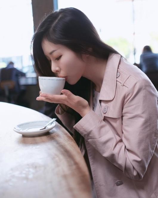 단정한 분홍 버버리코트에 커피잔을 든 채 입에 대고 있는 모습이 청순하고 아름답다.