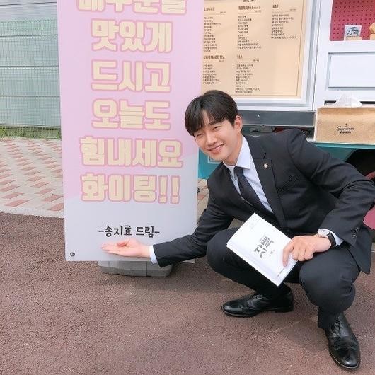 공개된 사진 속 이준호는 송지효가 보내준 커피차 앞에서 포즈를 취하고 있다. 이준호는 '송지효 드림'이 적힌 현수막 앞에서 방긋 미소 짓는 등 기쁨을 드러내기도 했다.