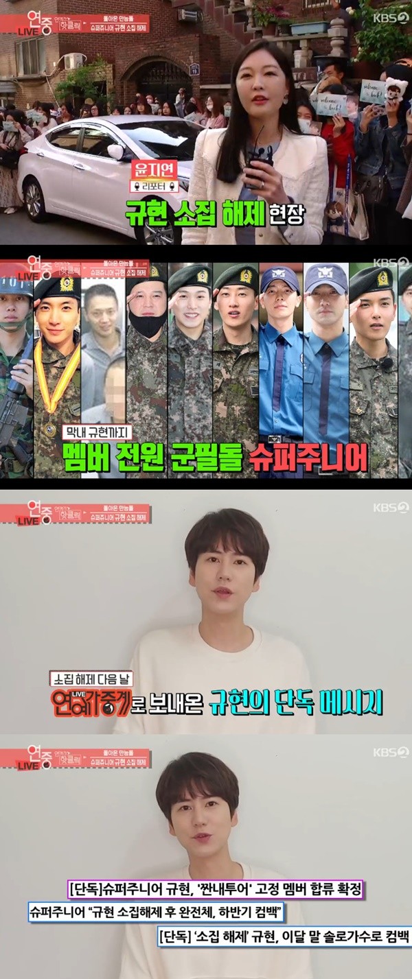 최근 방송된 KBS2 예능프로그램 '연예가 중계'에서는 규현의 소집해제 현장을 찾는 모습이 전파를 탔다.