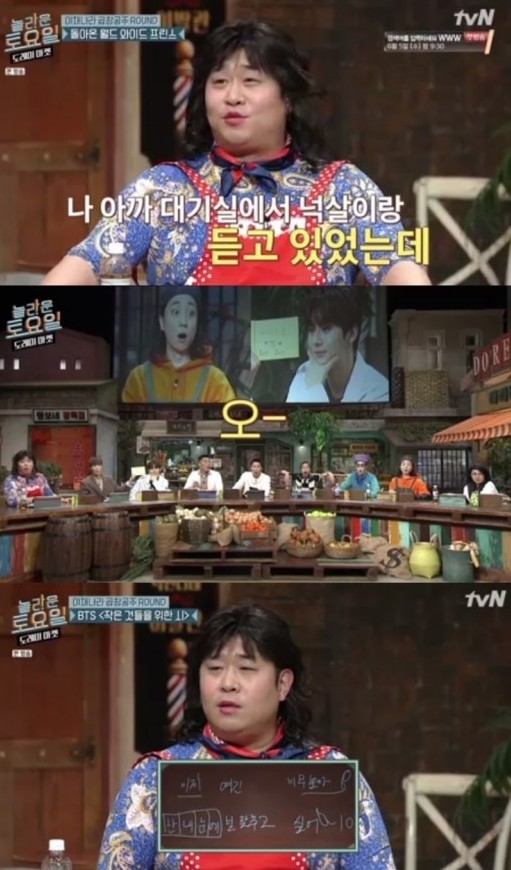 최근 방송된 tvN 예능 '놀라운 토요일'에서는 게스트로 뉴이스트 JR·민현이 출연한 가운데 방탄소년단의 '작은 것들을 위한 시'가 출제돼 도레미 멤버들의 시선을 사로잡았다.