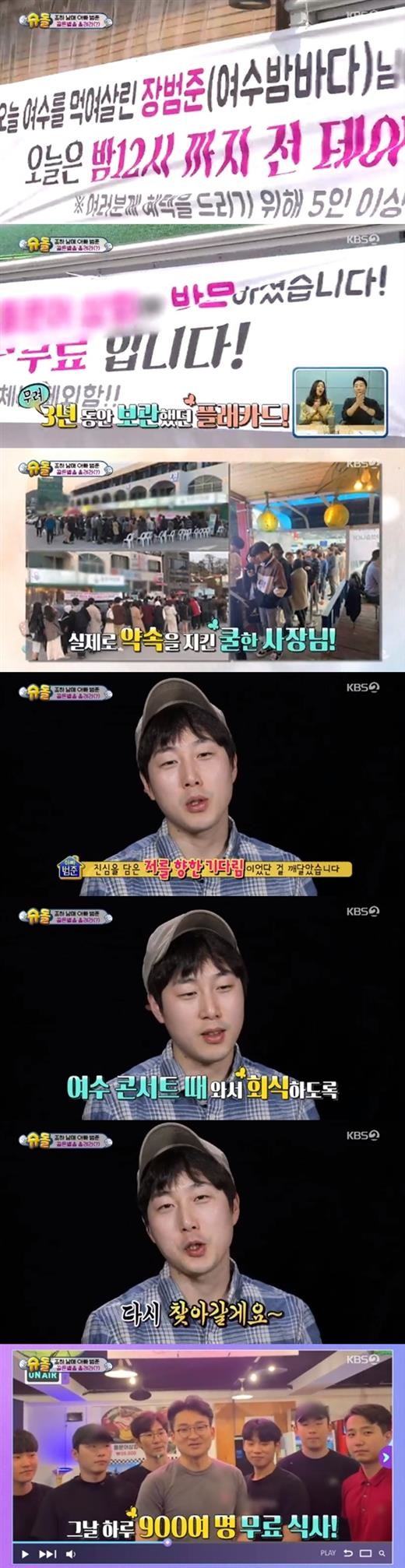 인터넷 커뮤니티에는 '여수를 먹여 살린 장범준, 여수 오면 전 테이블 식사 무료'라는 한 식당의 모습이 '짤'로 떠돌아다니고 있었던 바.