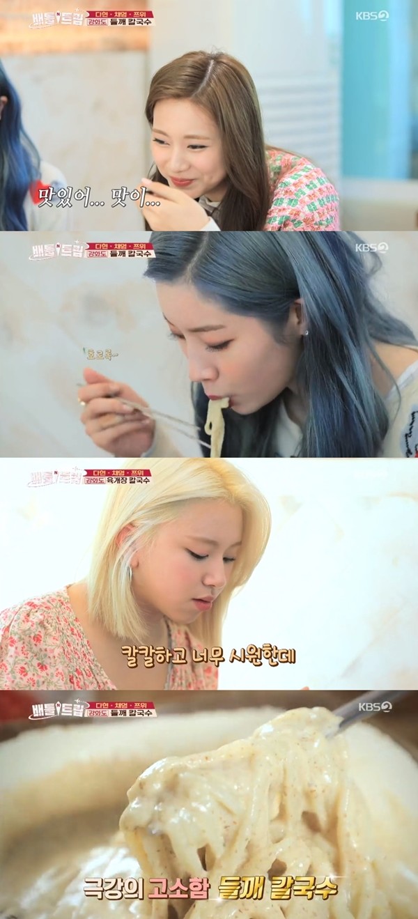 다현, 채영, 쯔위는 강화도의 한 음식점에서 육개장 칼국수를 맛봤다. 다현은 "얼큰하면서 시원하면서 너무 좋을 것 같다"고 말했다.