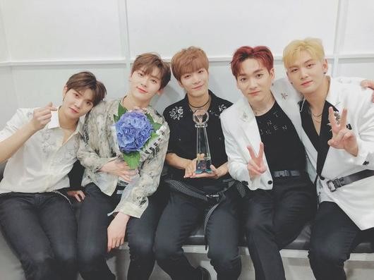 공개된 사진에서 뉴이스트 멤버들은 ‘뮤직뱅크’ 1위 트로피를 들고 옹기종기 앉아 있다. 렌, 민현, JR, 아론, 백호는 잘생긴 비주얼과 훈훈한 미소로 보는 이들의 시선을 강탈한다. 종현의 손에 고이 들린 트로피가 인상적이다.