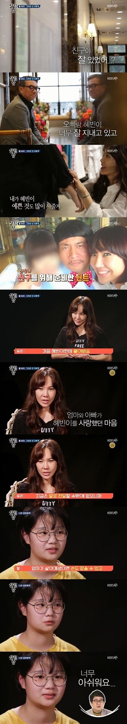 울컥해하던 유리는 제작진과의 인터뷰에서 "눈물을 많이 참았다. 혜빈이 때문에. 가끔 혜빈이한테 '엄마가 언제 제일 그리워'라고 묻는다. 혜빈이는 엄마에 대한 기억이 아예 없다. 그래서 좋았던 기억을 많이 말해주고 싶다. 아빠와 엄마가 정말 많이 사랑해줬다. 그걸 말로만 전달할 수 있으니 너무 아쉽다"라고 속내를 털어놨다.