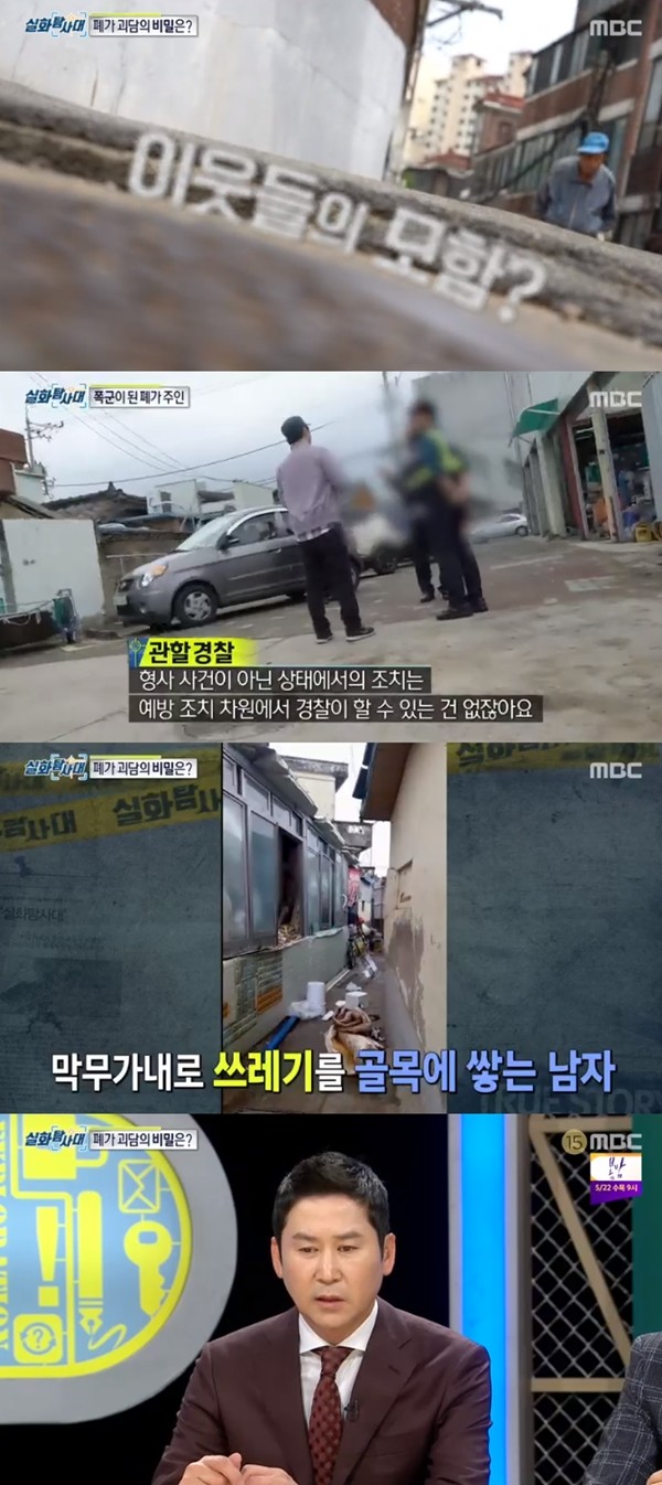 이에 동네 주민들은 불편함을 토로했지만 경찰은 "법 테두리 안에서 움직이기 때문에 그를 제지할 수 없다"고 선을 그었다. 이에 대해 집주인은 "고물을 팔아 생계를 유지하는 중"이라고 해명했다.