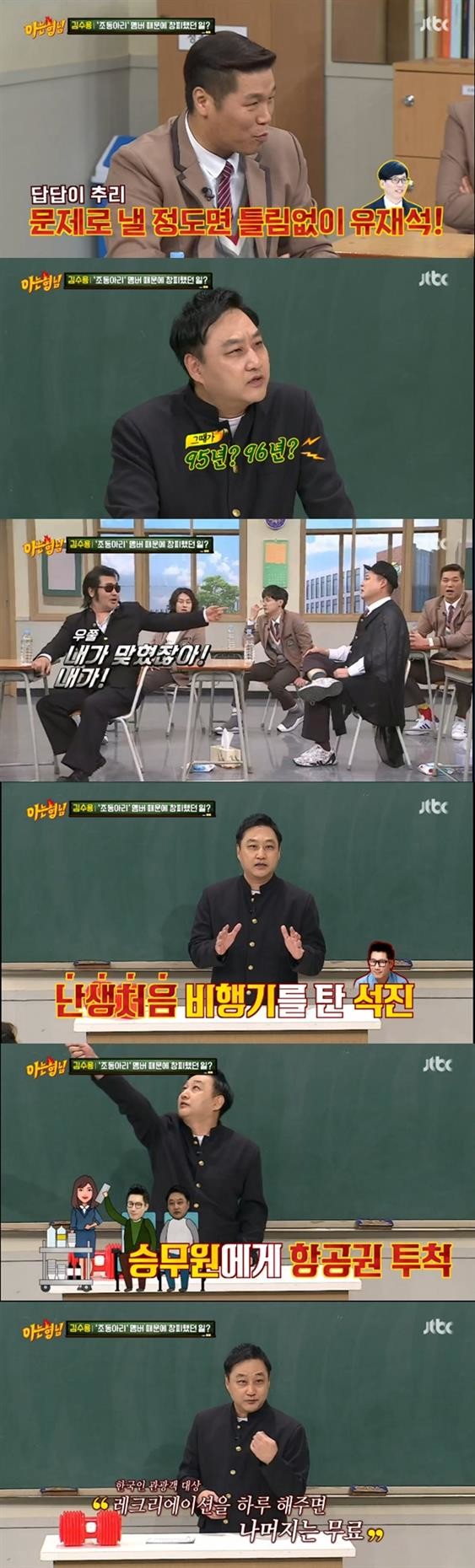 김수용은 "당시 지석진이 처음 비행기를 탔던 것이었다"며 "옆에서 너무 창피했다"고 말해 웃음을 줬다. 그는 당시 레크레이션을 해주는 대신 지석진과 괌을 공짜여행으로 갔다고 말했다.