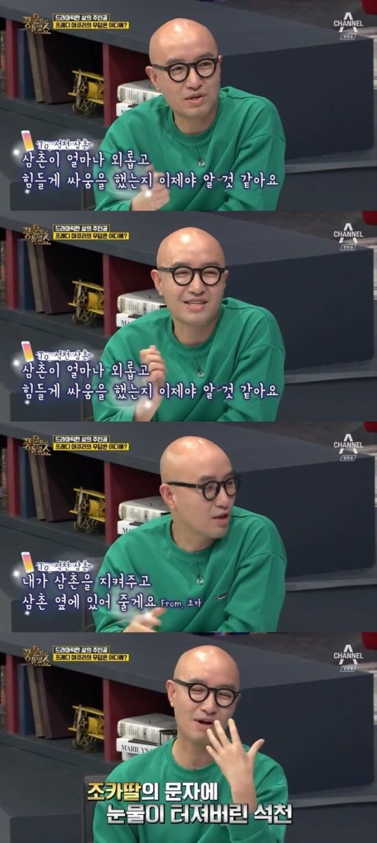 그러던 중 홍석천은 "얼마 전에 제가 입양한 조카이자 딸이 새벽에 문자가 왔다. '삼촌이 얼마나 외롭고 힘들게 싸움을 했는지 이제 알 것 같아요. 그런데 걱정하지 말아요. 내가 삼촌을 지켜주고, 삼촌 옆에 있어 줄게요'라고 하더라"라고 전했다. 그는 "이 문자를 새벽에 보는데 눈물이 빵 터졌다"고 털어놨다.