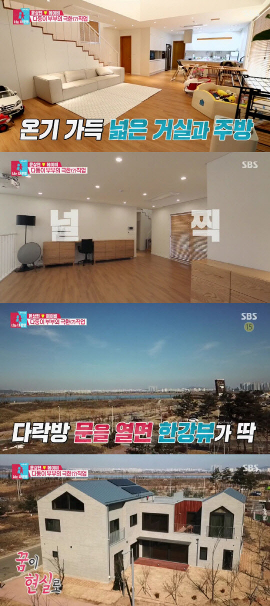 윤상현 메이비 부부의 집은 넓은 거실과 주방, 안방이 1층에 자리했고, 2층에는 삼남매의 방과 음악 작업실이 있었다. 특히 가족의 힐링 장소인 중정과 꼭대기 층의 감성 가득한 다락방은 '윤비하우스'의 포인트. 다락방 문을 열면 한강뷰가 드넓게 펼쳐진다.