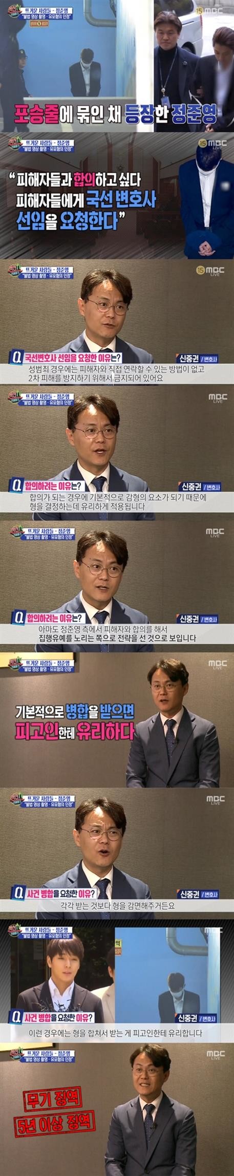 정준영이 합의하려는 이유에 대해 "합의가 되는 경우에 기본적으로 감형의 요소가 되기 때문에 형을 결정하는 데 유리하게 적용된다"면서 "피해자와 합의된 경우에는 초범이거나 가중 사유가 없는 경우에는 집행유예로 석방되는 경우가 많다"고 말했다. 그러면서 "정준영 측에서도 전략을 피해자와 합의를 해서 집행유예를 노리는 쪽으로 전략을 삼은 것으로 보인다"고 의견을 전했다.