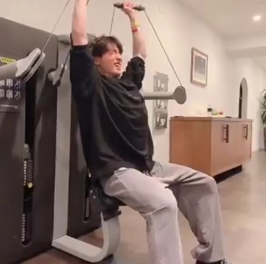 공개된 영상 속에는 정국이 강도 높은 운동을 하고 있는 모습이 담겼다. 정국은 성인 한 명과 가까운 무게를 들며 힘겨워 하는 기색이 역력하지만 끈질기게 팔 운동을 이어가고 있다.
