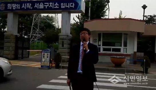 | ▲ 미디어워치 변희재 대표의 이동환 변호사가 17일 오후 서울구치소 앞에서 '보석거부'이유를 밝히고 있다. | ||