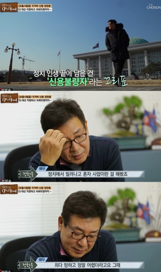 정한용은 지난 1996년 15대 국회의원 선거에 출마, 당선되며 정계에 입성했다. 그러나 2000년 정계 은퇴까지 정한용은 연예인 출신 정치인이란 이유로 편견에 시달려야 했다. 16대 선거 낙선으로 정계를 떠난 그에게 남은 건 신용불량자란 꼬리표였다.